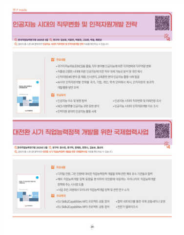 QR코드를 스캔 OR 클릭하면 인공지능 시대의 직무변화 및 인적자원개발 전략 자료를 확인하실 수 있습니다 QR코드를 스캔 OR 클릭하면 지난 10년간 한국인의 역량은 어떻게 변화했는가(OECD 국제성인역량조사(PIAAC) 2주기 보고서)자료를 확인하실 수 있습니다.