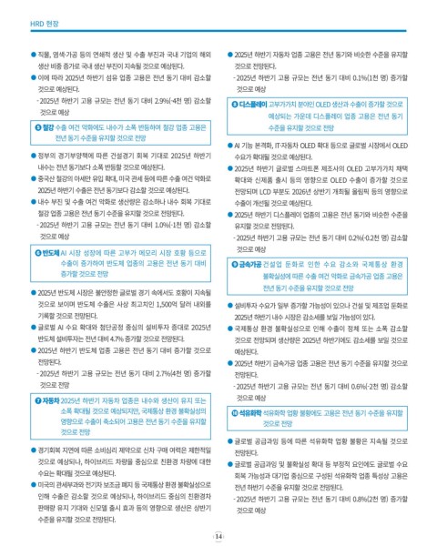 ● 직물, 염색·가공 등의 연쇄적 생산 및 수출 부진과 국내 기업의 해외 ● 2025년 하반기 자동차 업종 고용은 전년 동기와 비슷한 수준을 유지할