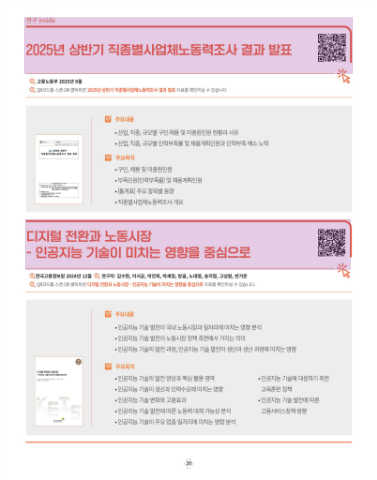 QR코드를 스캔 OR 클릭하면 2025년 상반기 직종별사업체노동력조사 결과 발표 자료를 확인하실 수 있습니다 QR코드를 스캔 OR 클릭하면 산업계 주도의 직무변화 모니터링 컨설팅 연구 자료를 확인하실 수 있습니다.